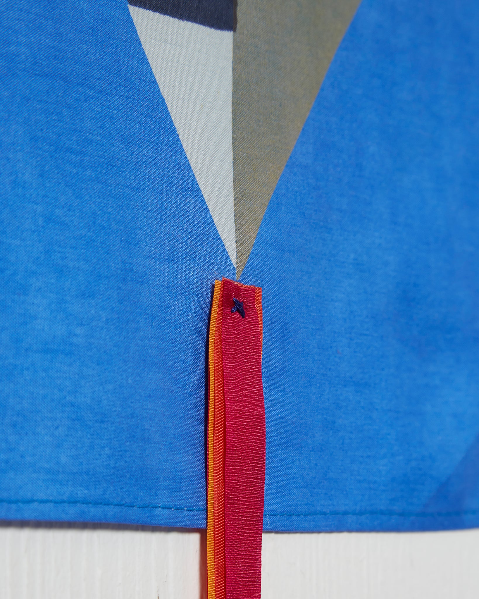 Hand screen-printed silk banner with silk ribbon embellishments.