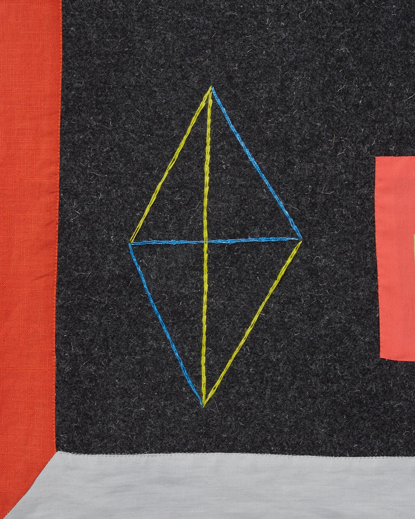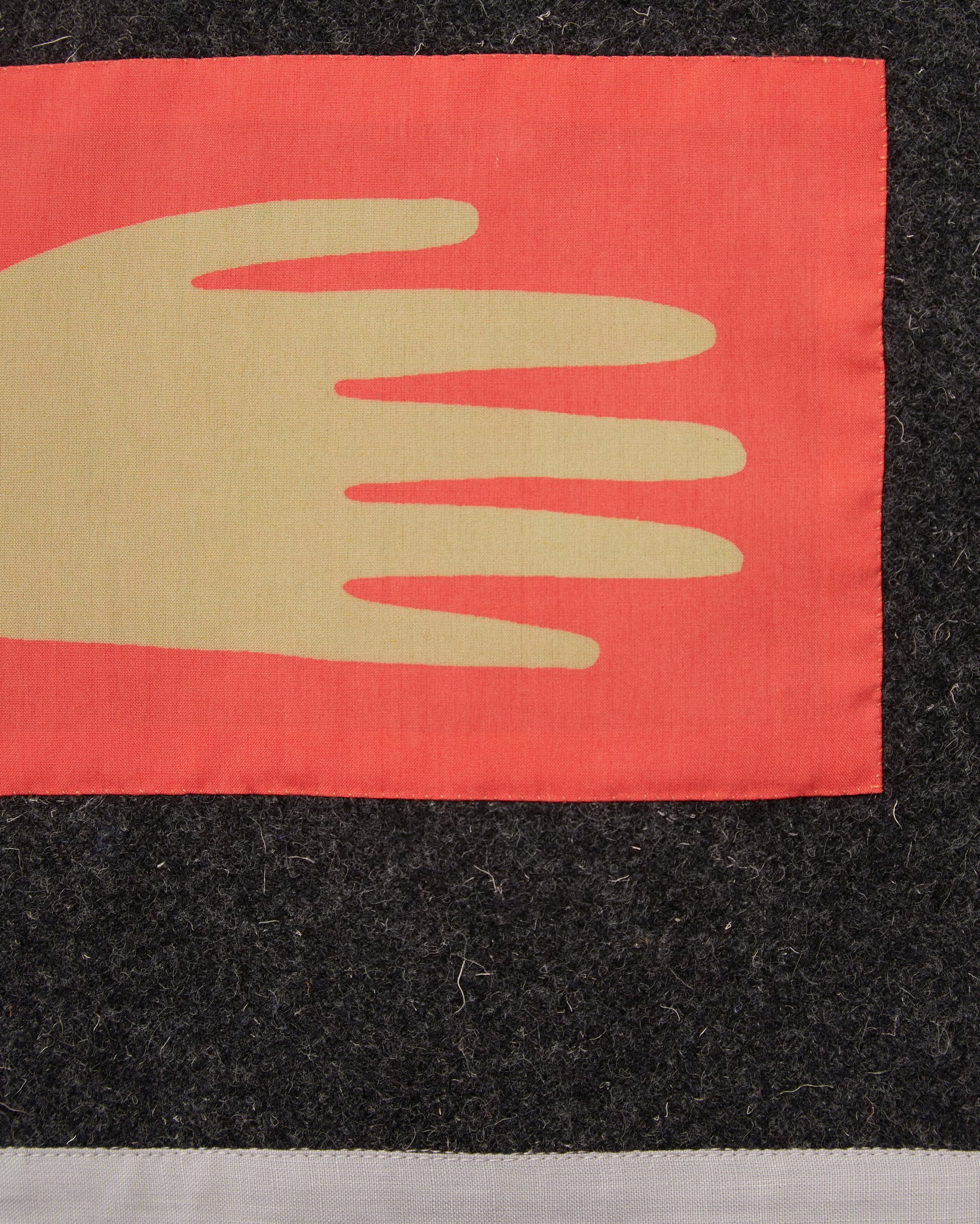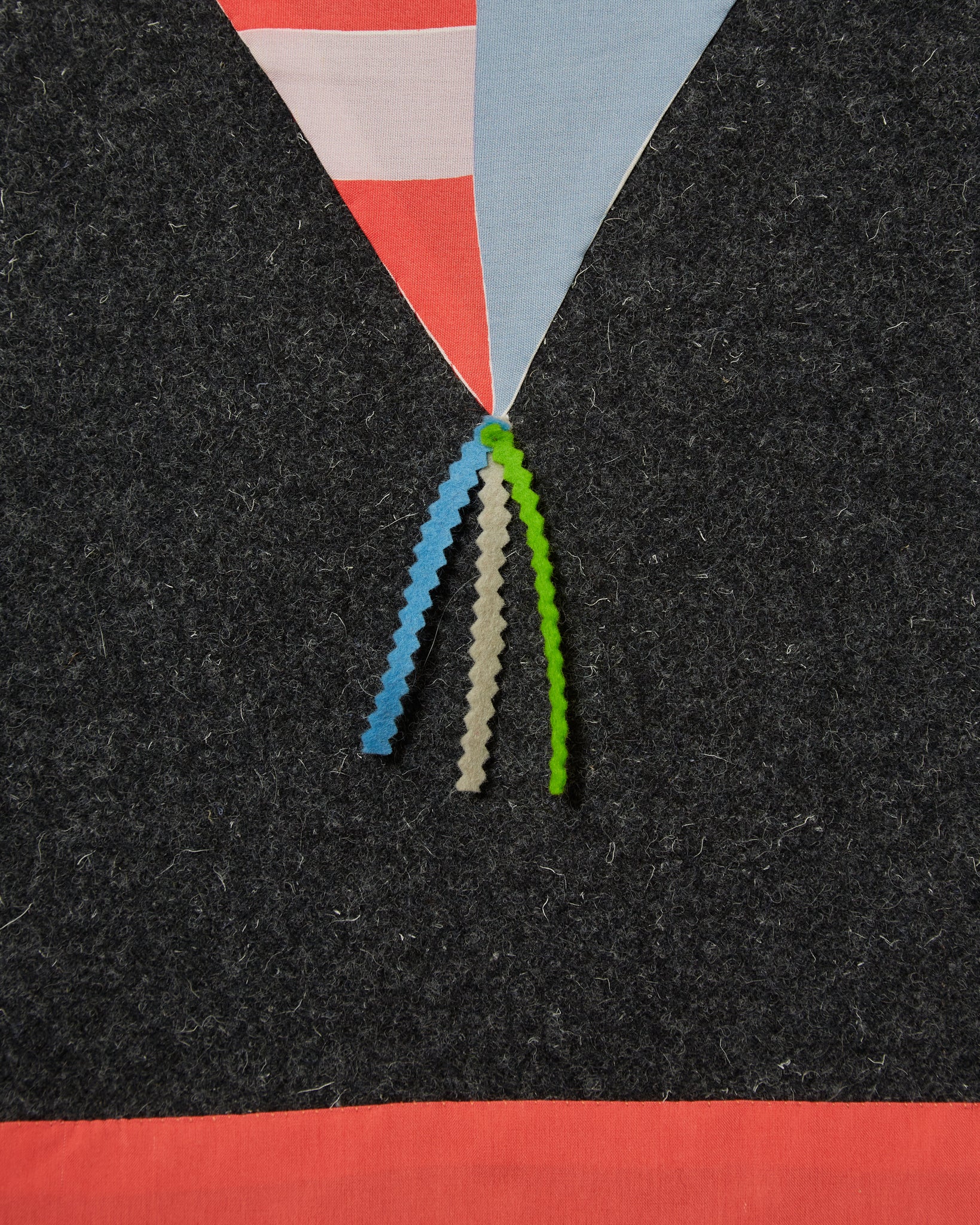 Silk patches are hand-dyed and printed with dyes and appliquéd onto a thick dark grey wool with multi-coloured linen edging. Featuring hand-embroidered motifs and wool felt embellishments.